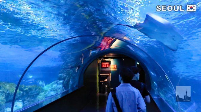The COEX Aquarium also features several smaller exhibits, many with a focus on entertaining children. One such exhibit, titled “Wonderland”, contains a collection of “eccentric fish tanks” including a shower cubicle, computer monitor, bath tub, and toilet bowl. Several exhibits specifically allow visitors to touch starfish and shellfish. (Info From Wikipedia)