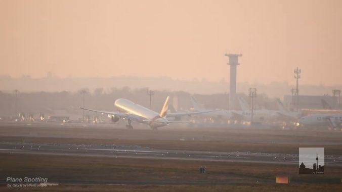 Emirates Boeing 777 takes off from Frankfurt Airport and makes nice right turn for Dubai
