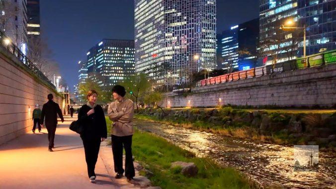 Walking Seoul at the Cheonggyecheon Stream at night time.